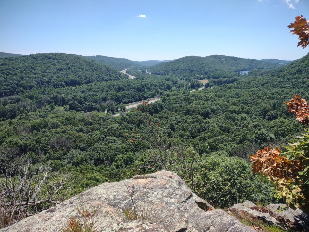 At the top, you’ll enjoy sweeping views over the central and eastern portion of Tuxedo, looking south and east toward Harriman State Park. This vantage point offers a unique perspective on the narrow valley corridor that forms much of the Town of Tuxedo. From here, you can observe the “veins of the town” snaking through the valley: the Ramapo River, the New York State Thruway, the Port Jervis line of the Metro North Train, and Route 17 highway. The bald-faced glacial rock outcrops at the edge of Wildcat Mountain are the ideal spot for that must-have scenic selfie and a quick snack!